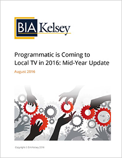 CHANTILLY, Va. (Aug. 1, 2016) – BIA/Kelsey today released its mid-year update in a series of Insight Papers focused on the promise of programmatic advertising in local television. Programmatic Is Coming to Local TV: 2016 Mid-Year Update suggests the adoption of programmatic ad buying in the national TV market offers instructive clues to understanding some of the forces that will drive programmatic ad buying at the local level.